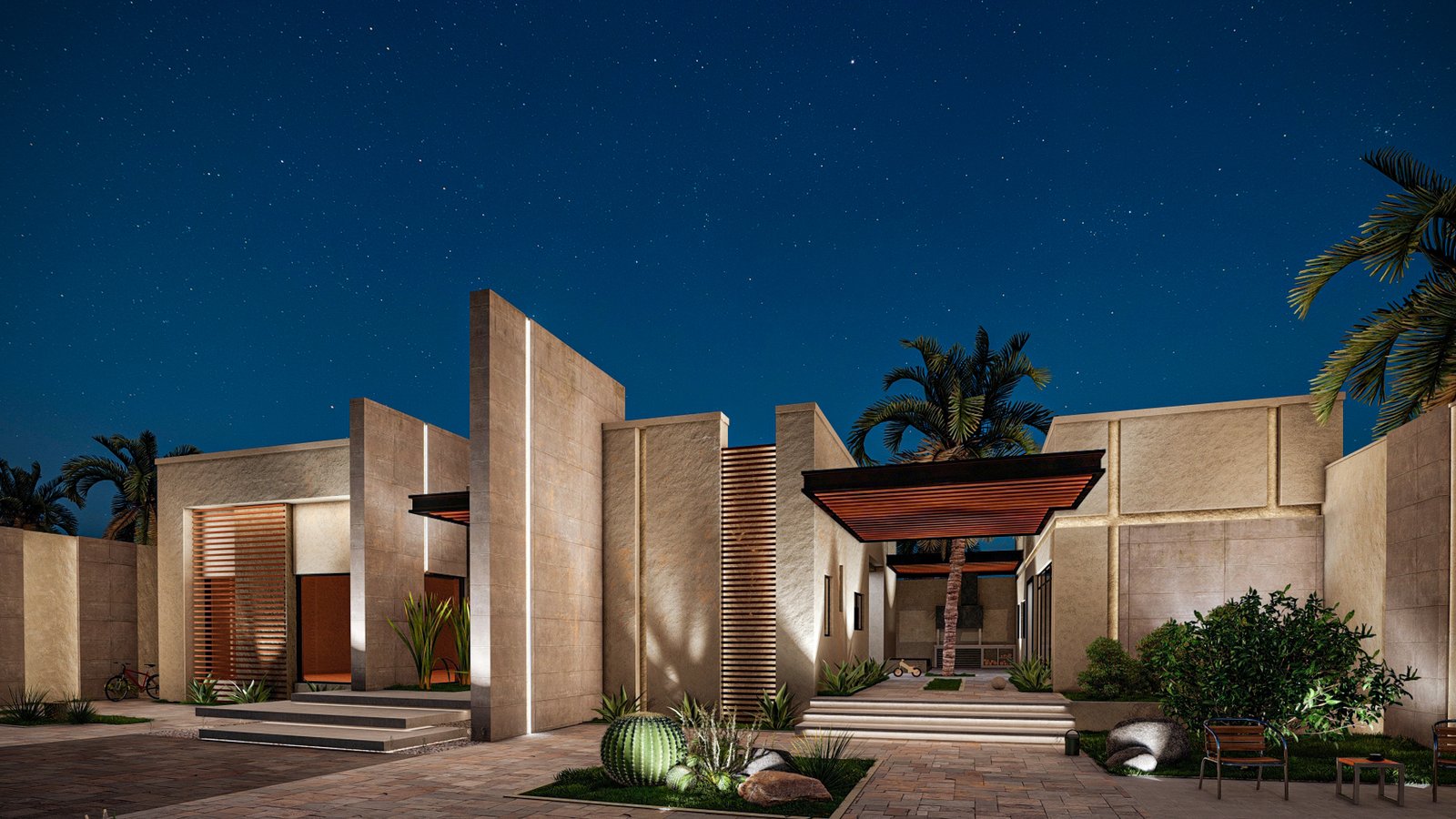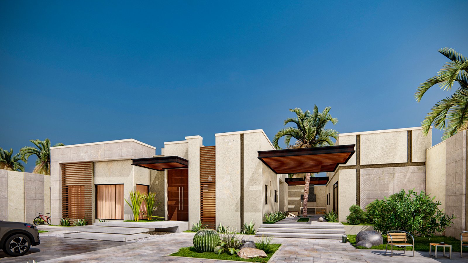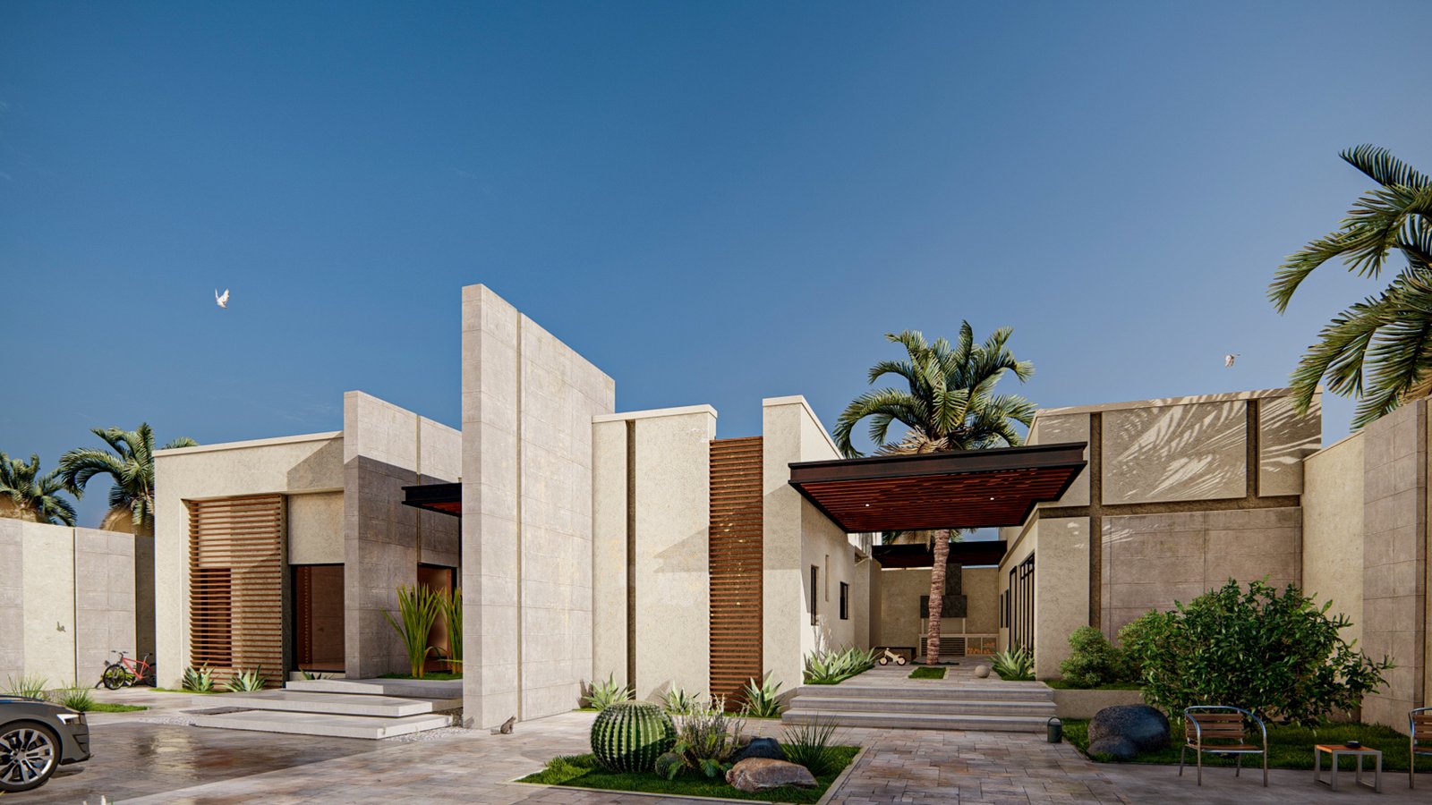 A modern villa project with a clean and elegant design, featuring natural materials and open spaces. It includes an inner courtyard and greenery that create a calm and relaxing atmosphere.
