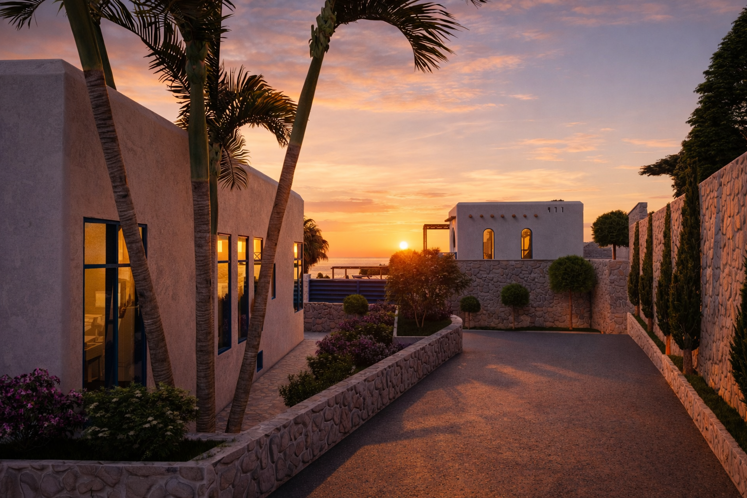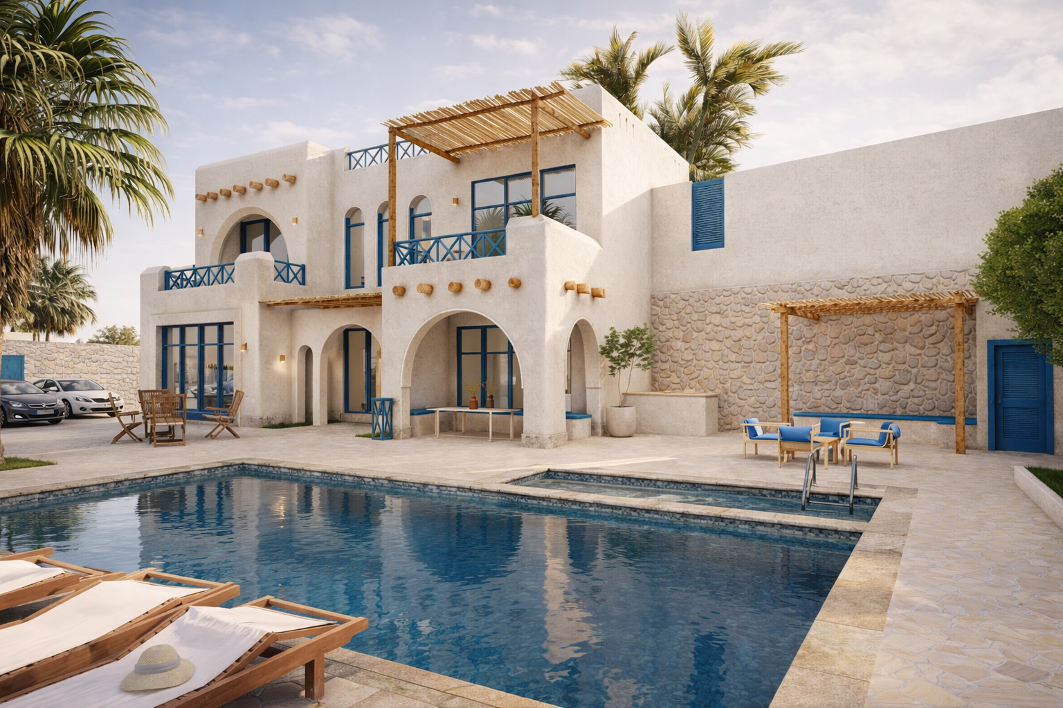 An elegant rustic design featuring white walls, classic arches, and natural stone and wood accents. The villa offers spacious outdoor areas and a large pool, making it a perfect retreat for relaxation in a calm and sophisticated atmosphere.