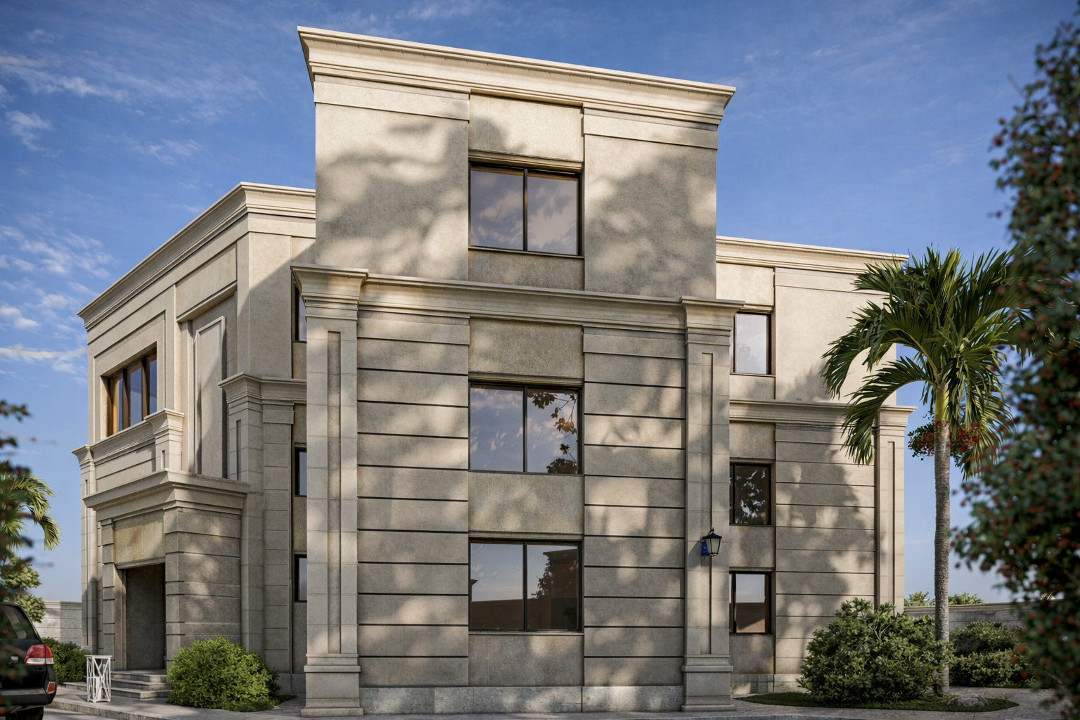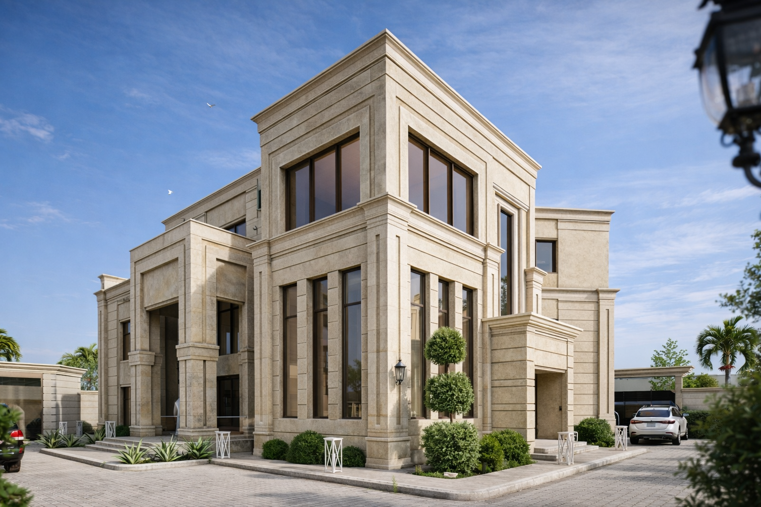 This mansion showcases a grand Modern Neoclassic design, characterized by structural symmetry and imposing stone-clad volumes. The main entrance features soaring pillars and intricate geometric moldings that evoke a sense of royal elegance, while large vertical windows perfectly balance the solid stone exterior with contemporary transparency. The meticulously landscaped surroundings enhance its presence as an architectural masterpiece.